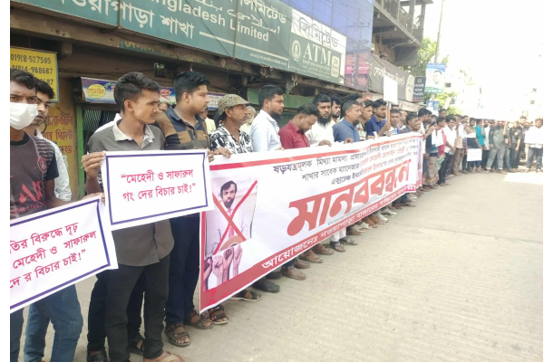মানববন্ধনে বক্তারা অভিযোগ করেন, ব্যাংকের অসাধু কর্মকর্তা মোস্তফা মেহেদী হোসাইন চৌধুরী, সাফারুল ইসলাম