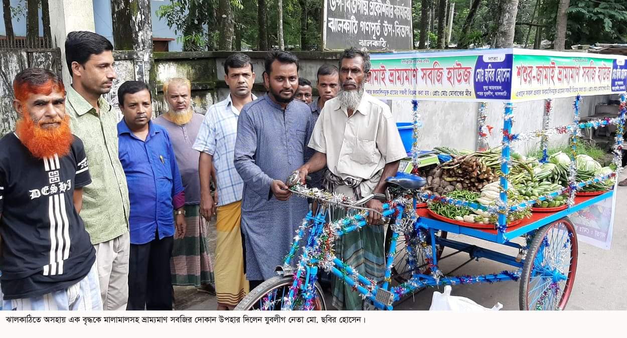 ঝালকাঠিতে অসহায় বৃদ্ধের কষ্টের জীবনযাপনের কথা শুনে তাকে মালামালসহ সবজির ভ্রাম্যমাণ দোকান উপহার দিয়েছেন শিশু সংগঠক ও যুবলীগ নেতা ছবির হোসেন।