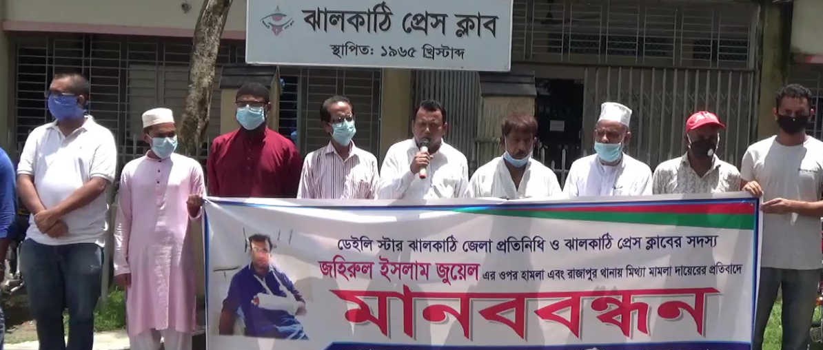 রবিবার (১৪ জুন) সকাল ১১ টায় ঝালকাঠি প্রেসক্লাবের সামনে প্রেসক্লাব ও প্রথমআলো বন্ধু সভা ঘন্টাব্যাপী এ মানববন্ধনের আয়োজন করে। মানববন্ধনে ঝালকাঠি প্রেসক্লাবের সাধারণ সম্পাদক মোঃ আককাস সিকদার, প্রথম আলোর প্রতিনিধি মাহামুদুর রহমান পারভেজ সহ অন্যন্যরা বক্তব্য রাখেন। এসময় বক্তারা সাংবাদিকদের উপর হামলাকারীদের দৃষ্ঠান্তমূলক সাস্তির দাবি ও মিত্যা মামলা প্রত্যাহারের দাবি জানান ।