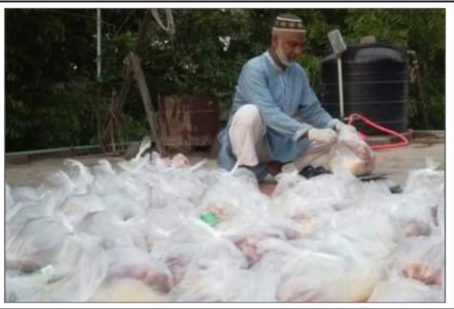 সরেজমিন গিয়ে দেখা যায় খাসনগর দীঘির পাড়ের নিজ ভবনের ছাঁদে বসে একাই অসহায় দরিদ্র পরিবারের জন্য চাল, পিয়াজ,সাবান ও আলু প্যাকেট করছেন পৌর স্বেচ্ছাসেবক লীগের সাধারন সম্পাদক মো: হাজী আলাউদ্দিন। রাতের বেলা প্রতিটি অসহায় পরিবারের ঘরে ঘরে নিজ হাতে পৌছে দেবেন বলে জানান।