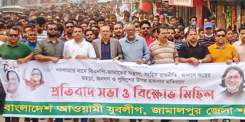 পদযাত্রার নামে বিএনপি-জামাতের সন্ত্রাস, সহিংস রাজনীতি, প্রকাশ্যে অস্ত্রের মহড়া, জনগণ ও পুলিশের উপর হামলার প্রতিবাদে কেন্দ্রীয় কর্মসূচির অংশ হিসেবে জামালপুরে বিক্ষোভ মিছিল ও প্রতিবাদ সভা করেছে জেলা যুবলীগ। সোমবার বিকেলে জেলা যুবলীগের উদ্যোগে বকুলতলা মোড় থেকে এ বিক্ষোভ মিছিল বের হয়। মিছিলটি শহর প্রদক্ষিণ করে দয়াময়ী মোড়ে গিয়ে শেষ হয়। পরে এক সংক্ষিপ্ত প্রতিবাদ সভা অনুষ্ঠিত হয়।