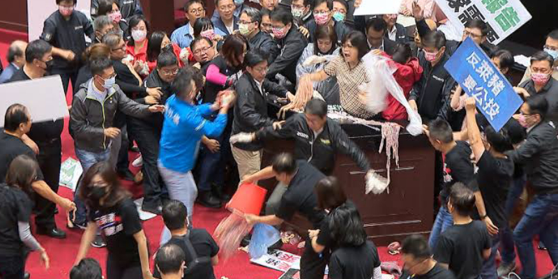 যুক্তরাষ্ট্র থেকে মাংস আমদানি করা নিয়ে শুক্রবার তাইওয়ান পার্লামেন্টে আলোচনা সভায় হাতাহাতির ঘটনা ঘটে । কথা কাটাকাটি ও হট্টগোলের এক পর্যায়ে প্রধান বিরোধীদল কুওমিনতাংয়ের সদস্যরা প্রধানমন্ত্রী সু তিসেং-চ্যাং এর ওপর শূকরের নাড়িভুঁড়ি ছুড়ে মারে।