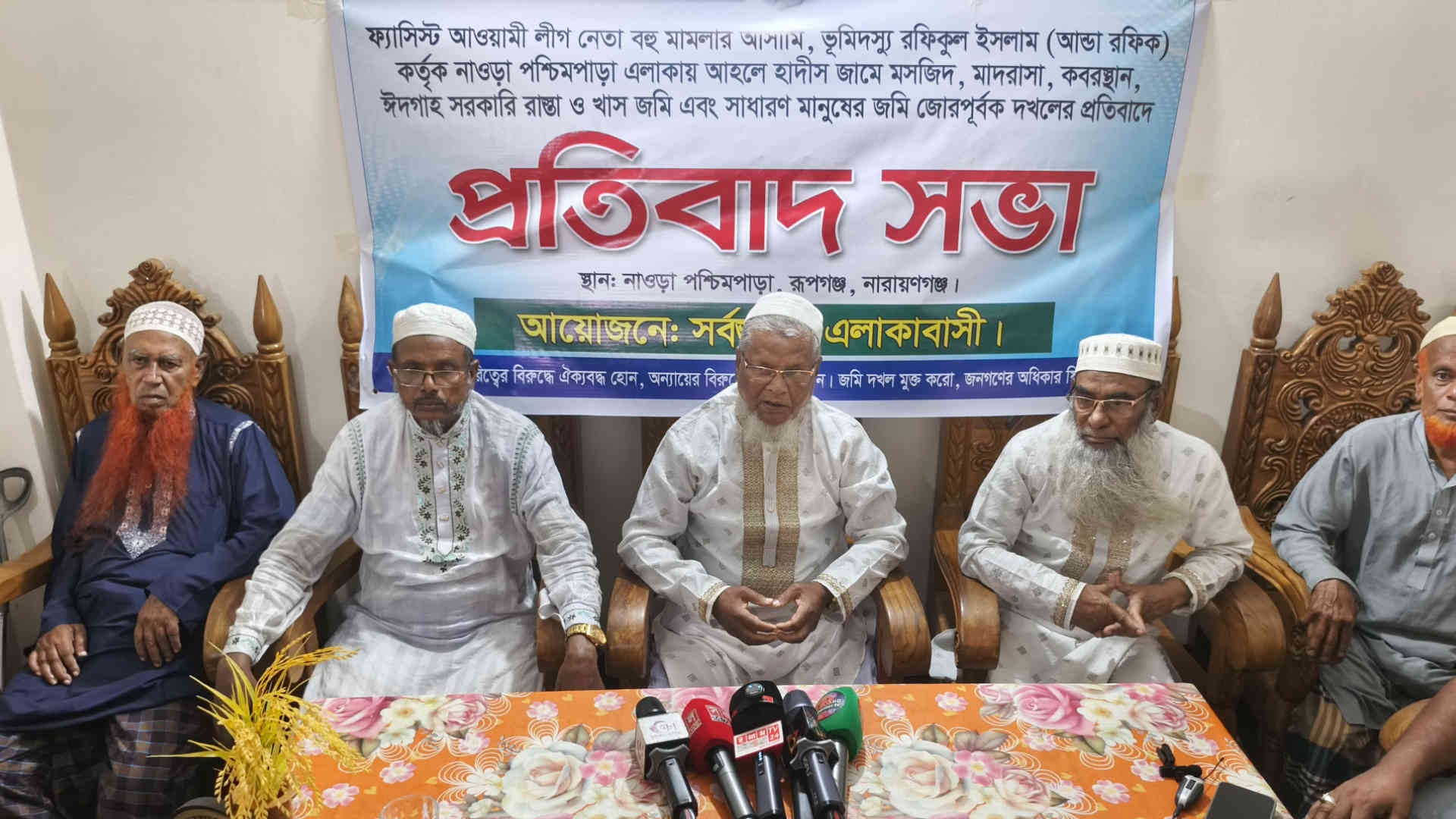 নারায়ণগঞ্জের রূপগঞ্জ উপজেলার কায়েতপাড়া ইউনিয়নের নাওড়া পশ্চিমপাড়া এলাকায় আওয়ামী লীগ নেতা ও আলোচিত ভূমিদস্যু রফিকুল ইসলাম (আন্ডা রফিক) কর্তৃক মসজিদ, মাদরাসা, কবরস্থান, সরকারি রাস্তা ও খাস জমি এবং সাধারণ মানুষের জমি জোরপূর্বক দখলের প্রতিবাদে বিক্ষোভ ও প্রতিবাদ সভা করেছে এলাকাবাসী।